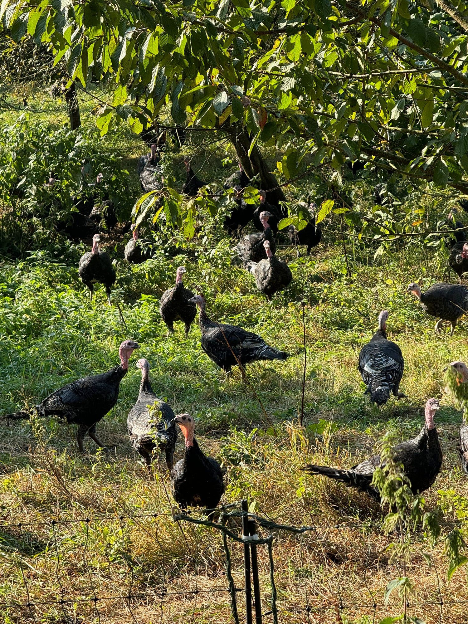 This sees some of our young turkeys found in the trees (they’re woodland birds after all) and it’s the open pastures of our farm that allows them to roam freely that makes them happy, healthy birds which results in the very best turkeys money can buy.