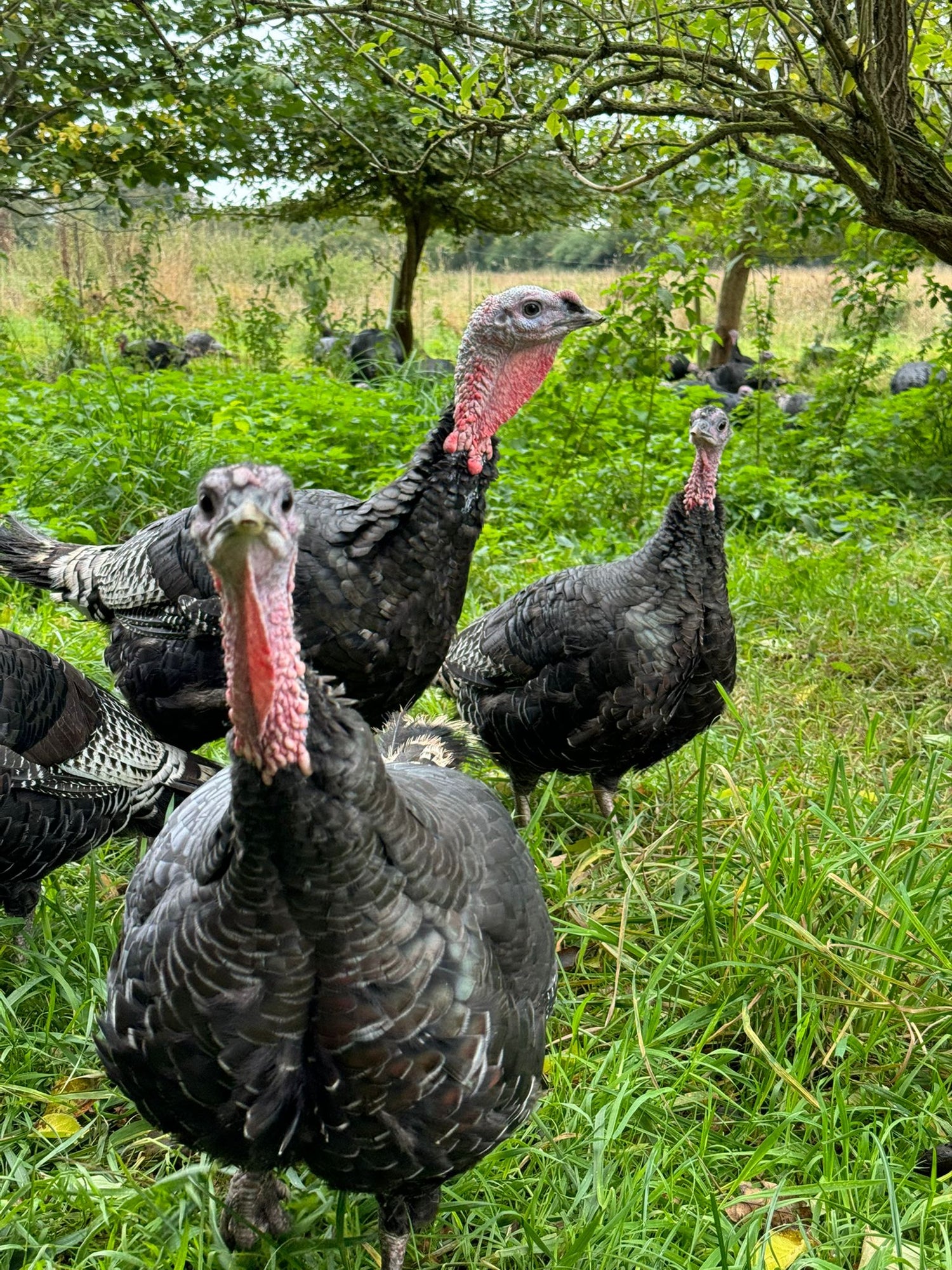 This sees some of our young turkeys found in the trees (they’re woodland birds after all) and it’s the open pastures of our farm that allows them to roam freely that makes them happy, healthy birds which results in the very best turkeys money can buy.
